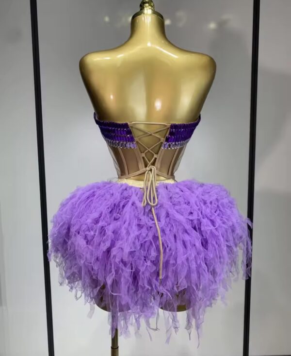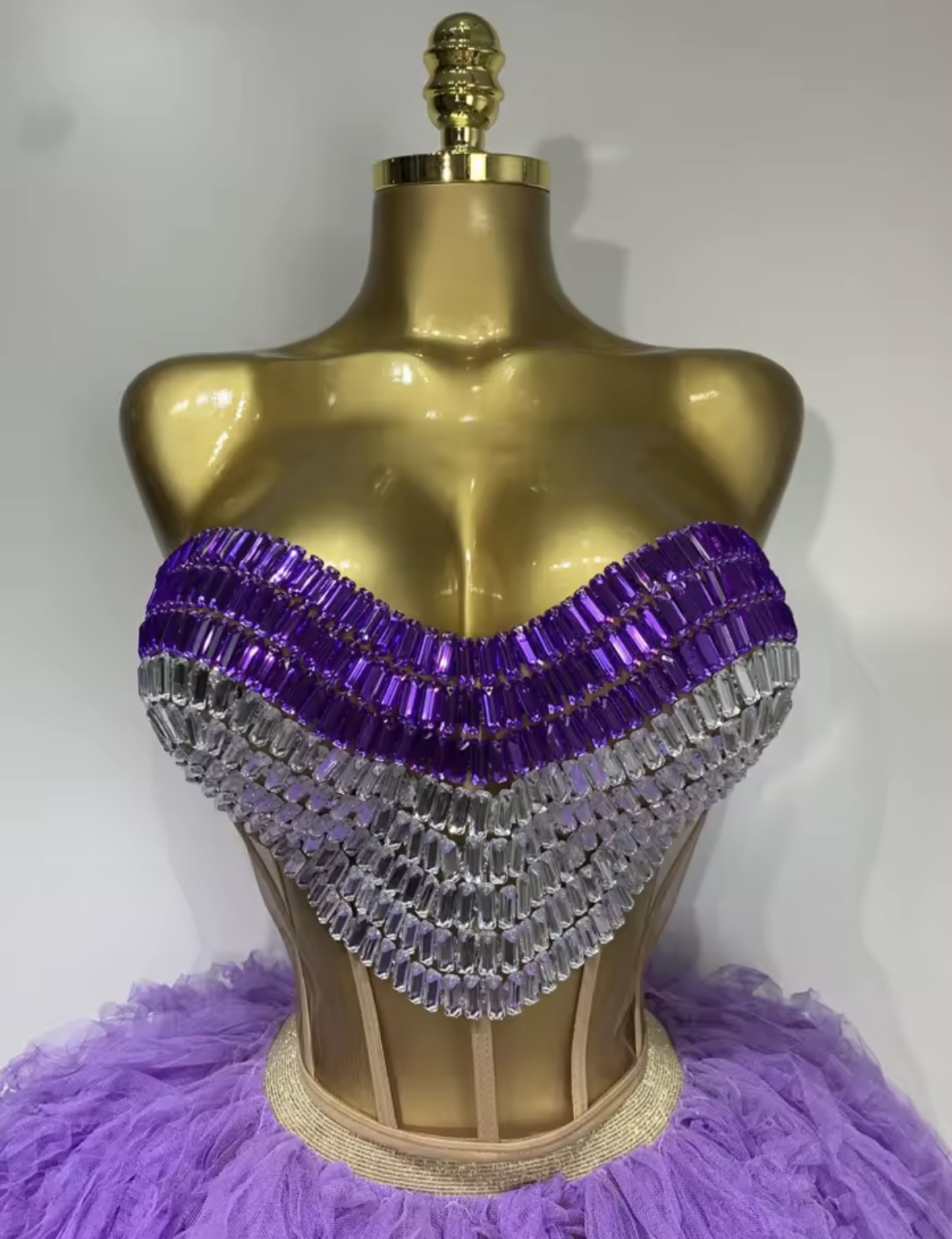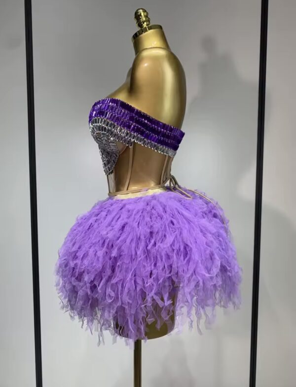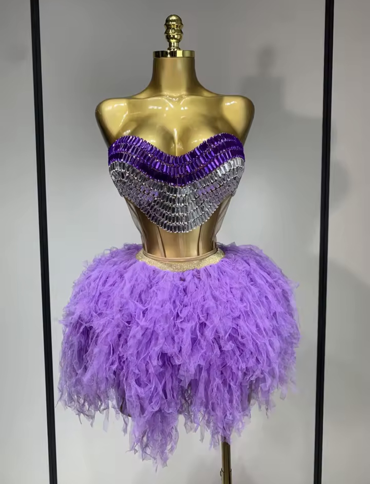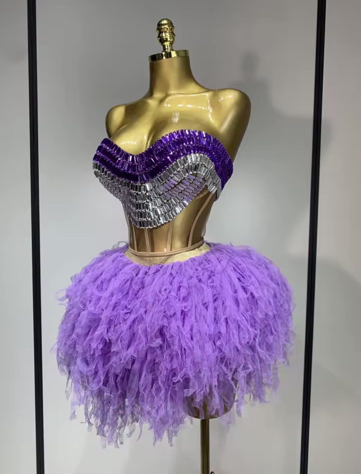 Turn every entrance into a statement. The Amethyst Stardust Couture Set is a bold couture-inspired design that blends glamour and playful elegance. The embellished metallic bustier features shimmering purple and silver detailing that catches the light beautifully, while the voluminous lavender feathered skirt creates movement and dramatic flair.