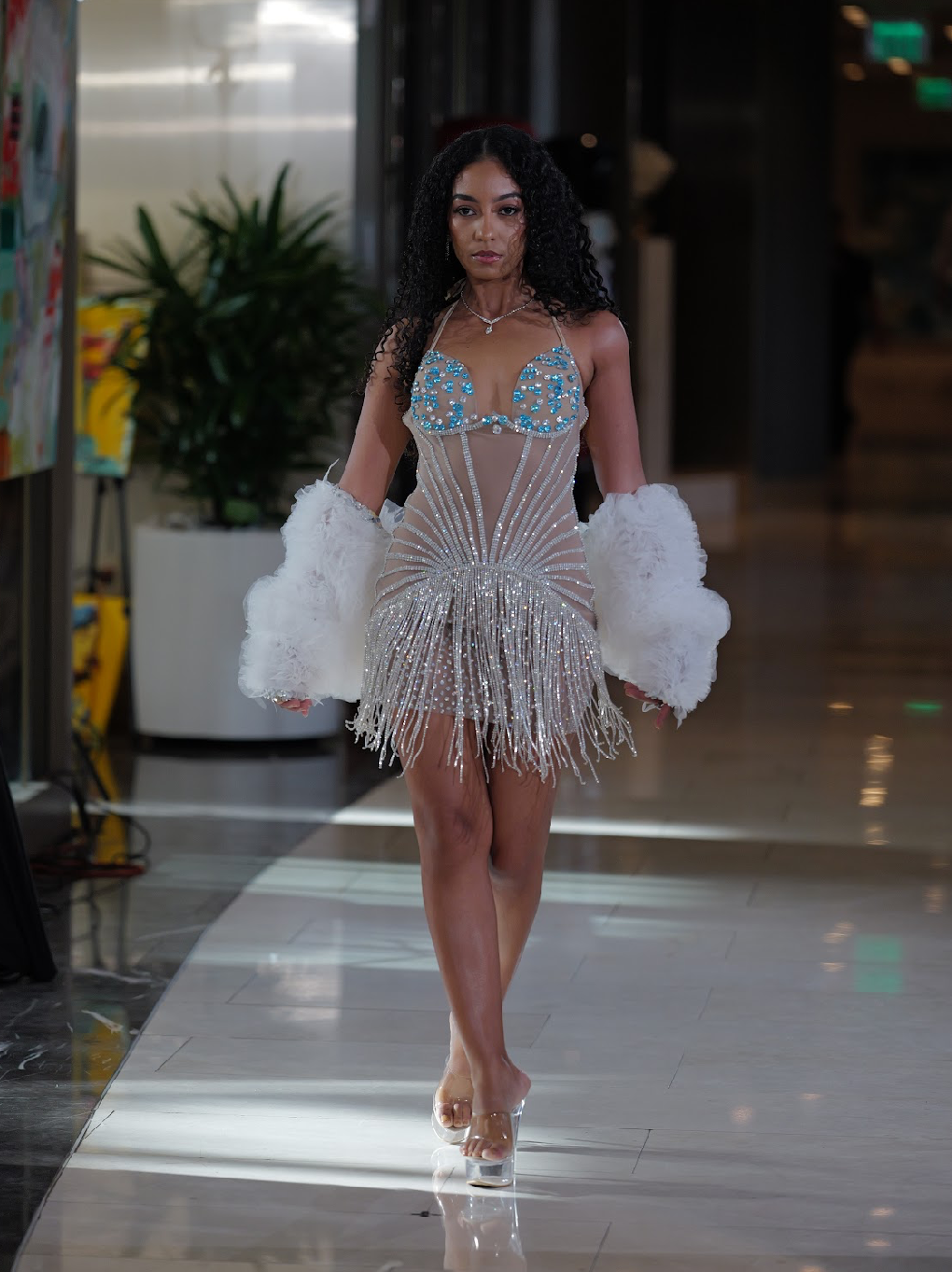 A model wearing a sculpted, body-hugging mini dress with a striking icy color palette. The bodice features vibrant aqua crystal appliqués arranged in a bra-style pattern that immediately draws the eye. Silver beadwork cascades down the torso in sleek, vertical lines that elongate the figure and lead into a shimmering fringe skirt that moves with every step. Soft white fur accents drape around the arms, giving the look a plush, luxurious contrast against the sparkling details. Clear platform heels add height and attitude. The overall vibe is cool, seductive, and high-impact — a frozen fantasy with runway dominance.