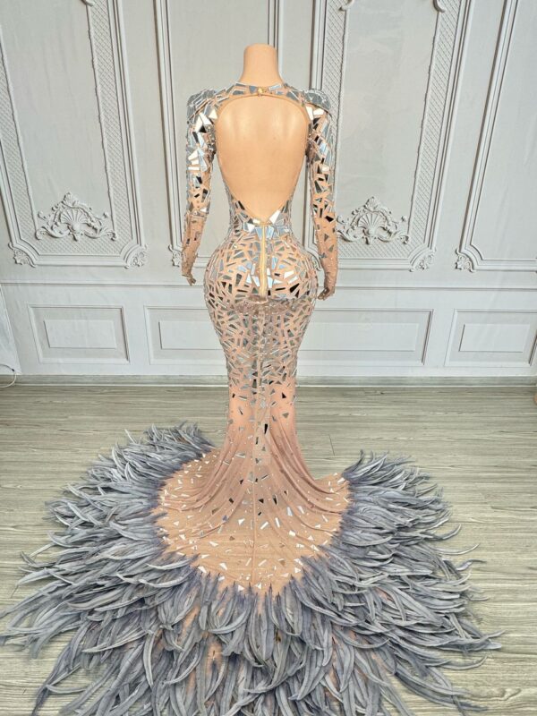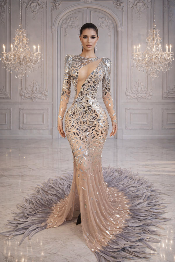 The Celestial Shard Feather Couture Gown features hand-applied mirrored shard embellishments over a sheer nude illusion base, sculpting the body in a striking, artful silhouette. Finished with a dramatic feathered train, this gown is designed for red carpets, runway moments, and grand entrances that demand attention.