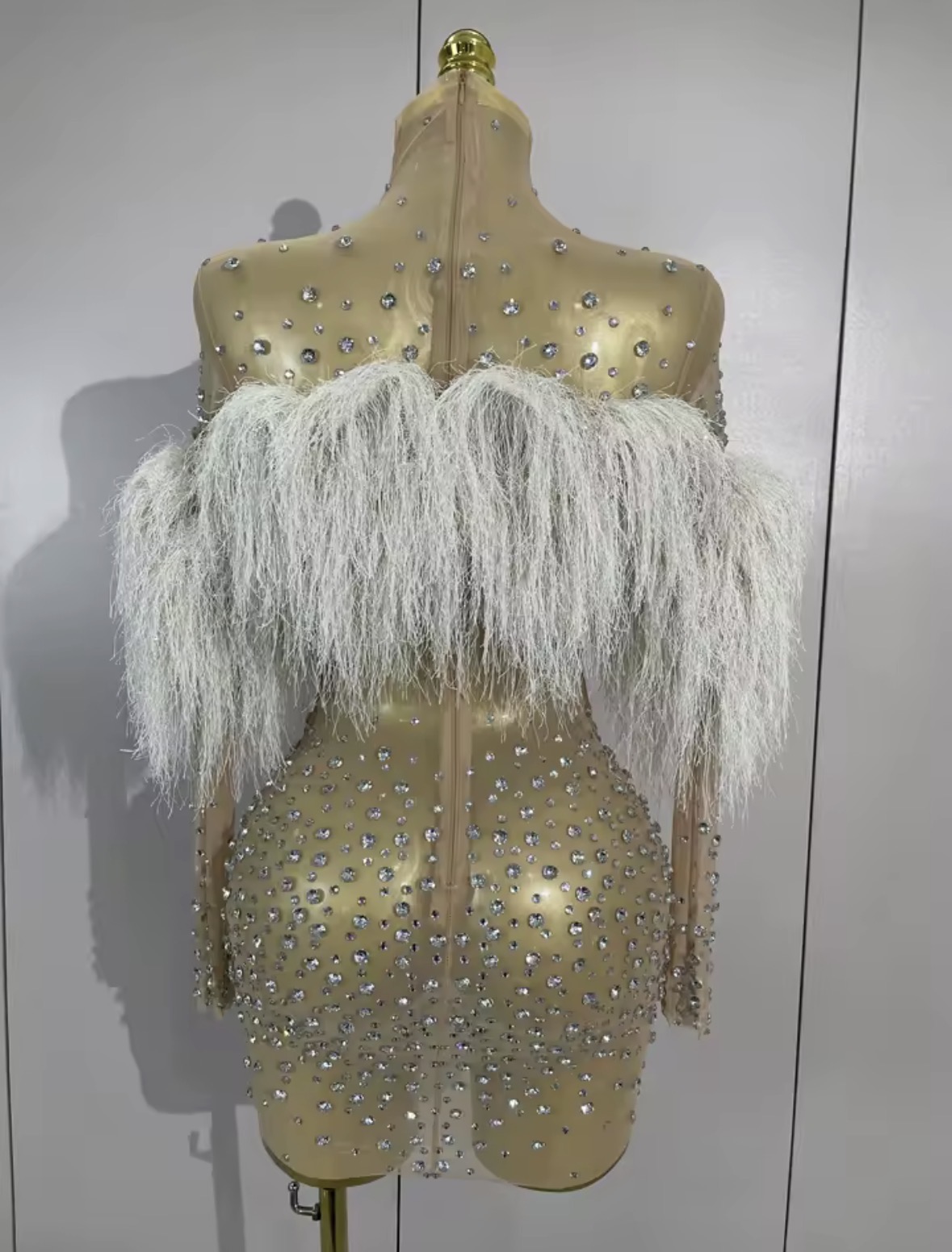 This design embodies SimAllure’s signature balance of elegance and bold femininity — delicate feathers, radiant crystals, and a silhouette made to command attention.
