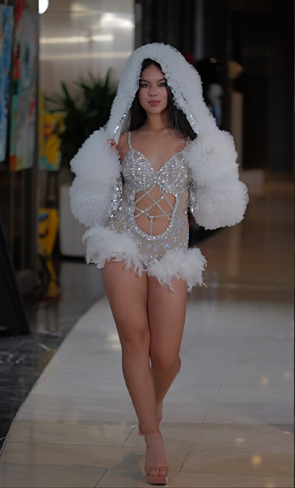 A model wearing a crystal-encrusted bodysuit with intricate geometric cutouts and silver embellishments that reflect the light with every step. The piece features fluffy white feather trim at the hips, adding movement and a winter-luxury edge. She’s draped in a dramatic oversized hooded fur coat, the hood framing her face like an icy halo. The look mixes bold skin-baring design with high-glam sparkle, giving a fierce, confident, cold-as-ice runway presence as she walks forward with poise.