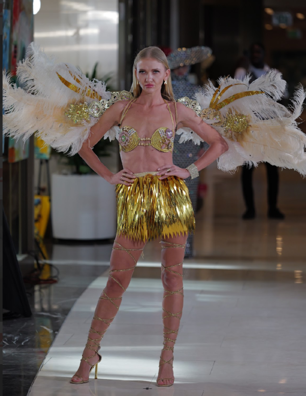 A model wearing a bold, show-stopping gold ensemble inspired by celestial fantasy and carnival glamour. The top is a jeweled gold bra with crystal accents and delicate straps, paired with a metallic fringe mini skirt that sways fiercely with every step. The look is elevated by massive angelic wings made of white feathers, gold detailing, and sparkling embellishments that fan out dramatically behind her. Gold lace-up heels climb the legs, tying the entire silhouette together. The vibe is powerful, radiant, and theatrical — a golden goddess with runway presence that hits like a spotlight.