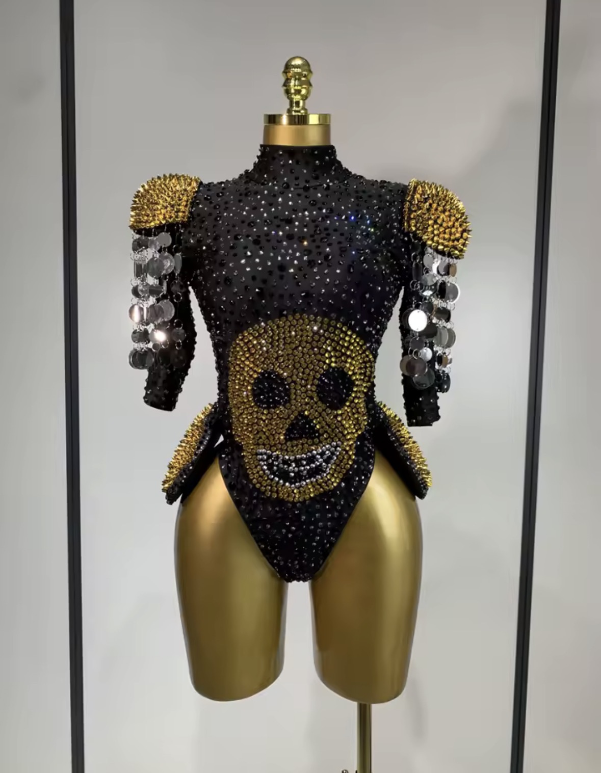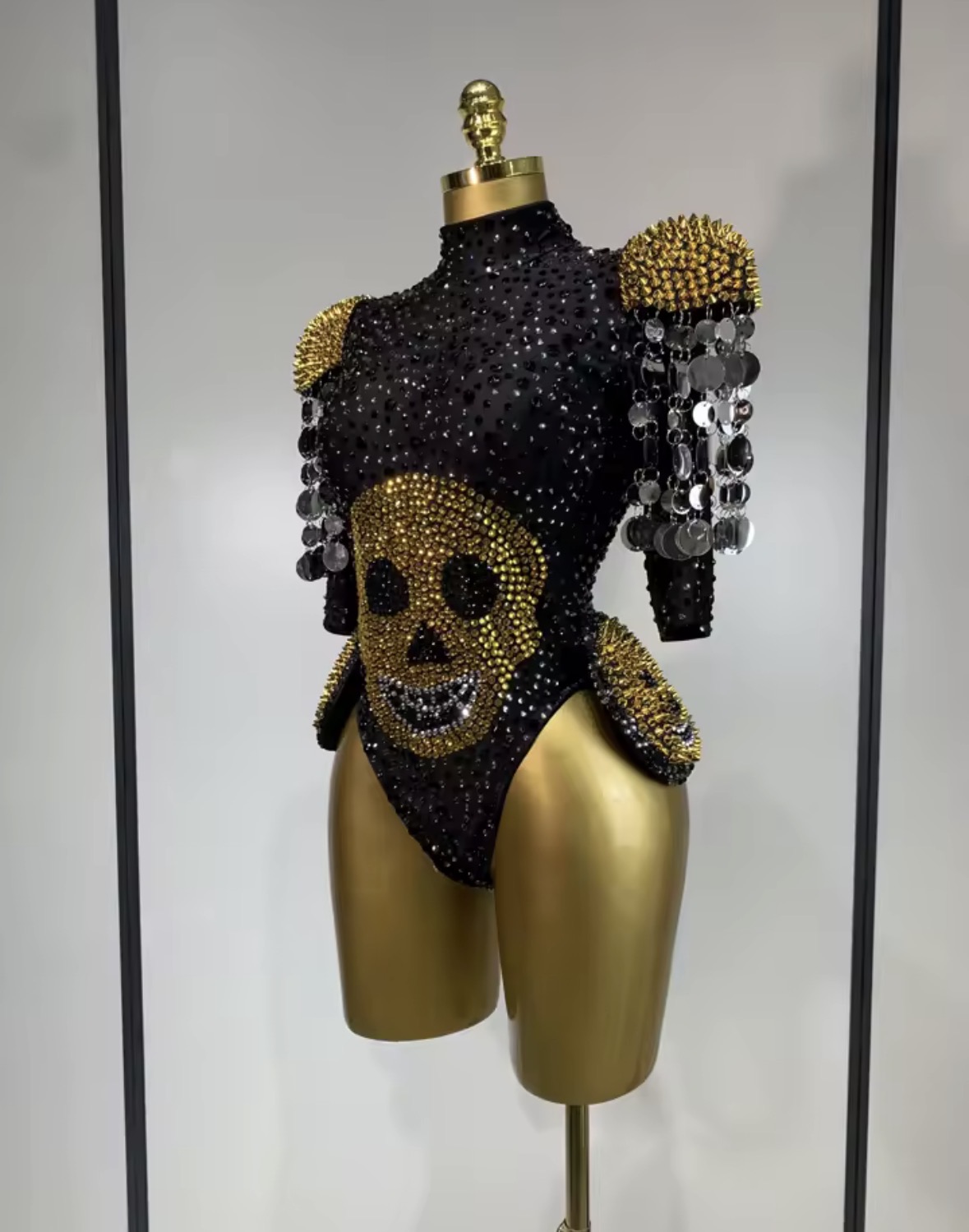 The Golden Rebellion Couture Bodysuit is designed for those who refuse to blend in. Featuring a dramatic crystal-embellished skull centerpiece, gold spike shoulder accents, and cascading metallic chain details, this statement piece merges couture craftsmanship with rock-star attitude.