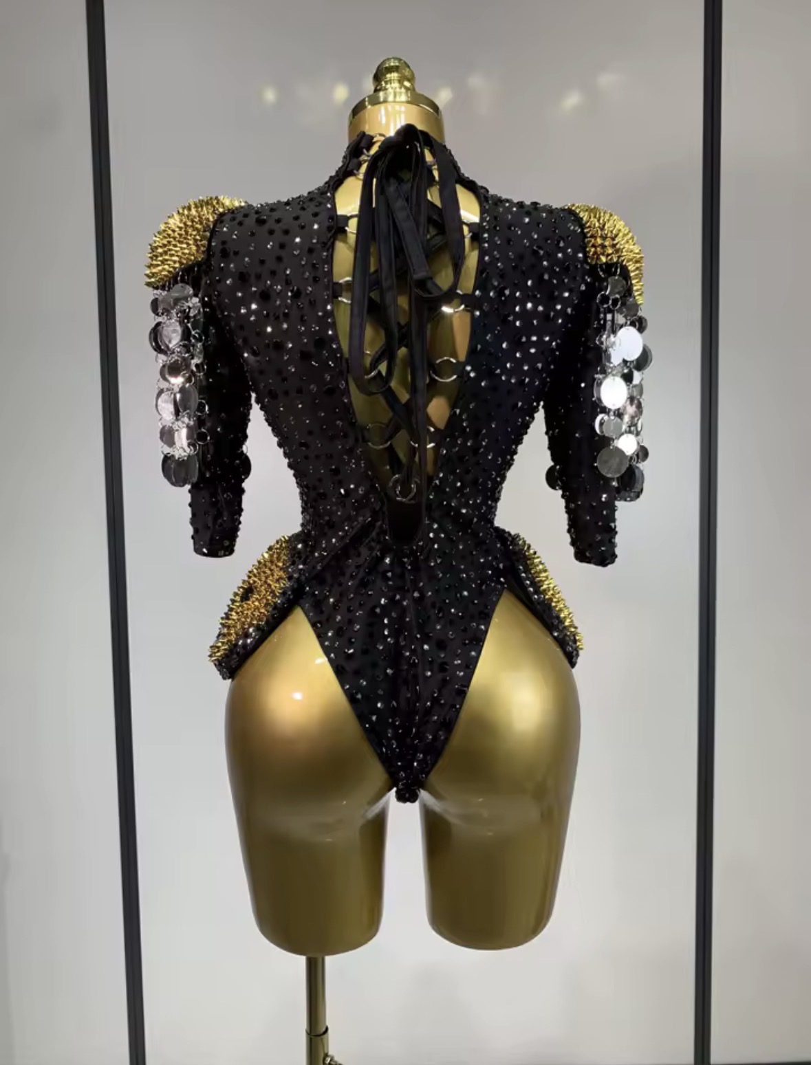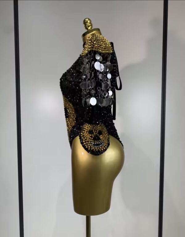 Hand-embellished with shimmering crystals and structured detailing, the bodysuit creates a powerful silhouette that commands attention from every angle. Perfect for performances, fashion editorials, stage appearances, and unforgettable nightlife moments.