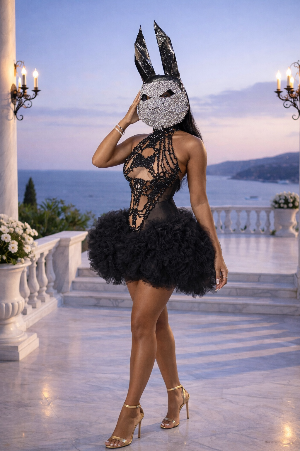 Mysterious, bold, and unforgettable—this design embodies the essence of modern couture and runway royalty.