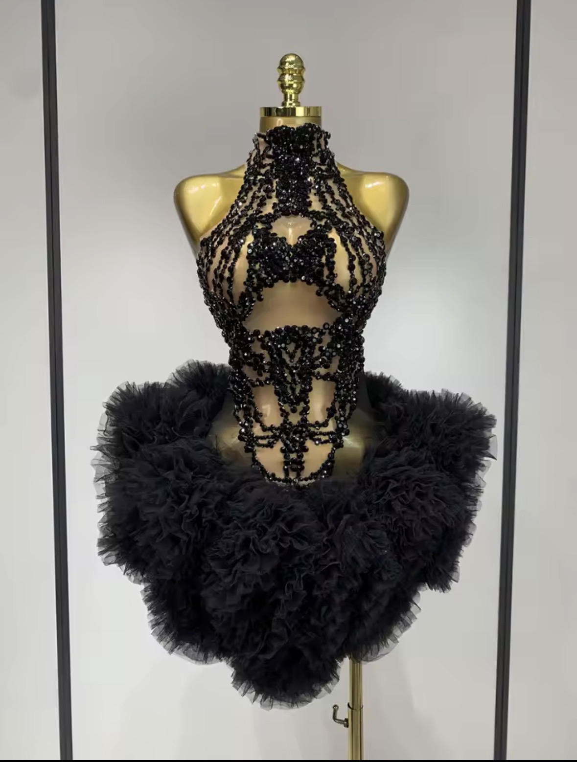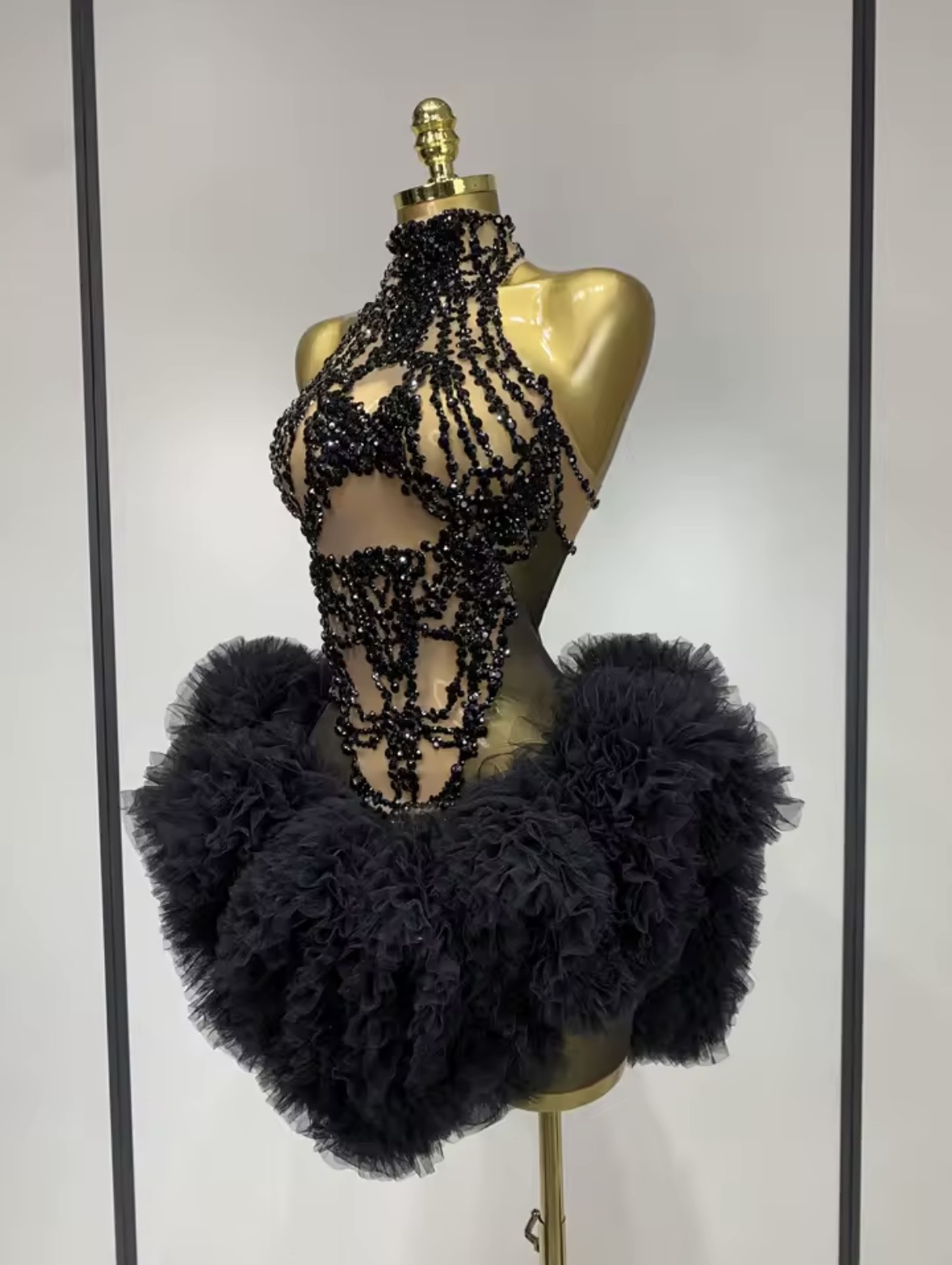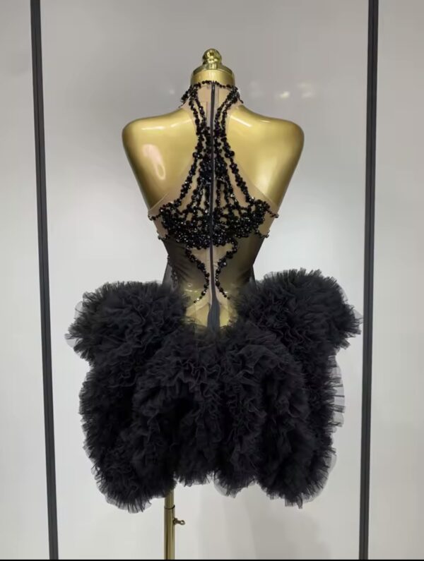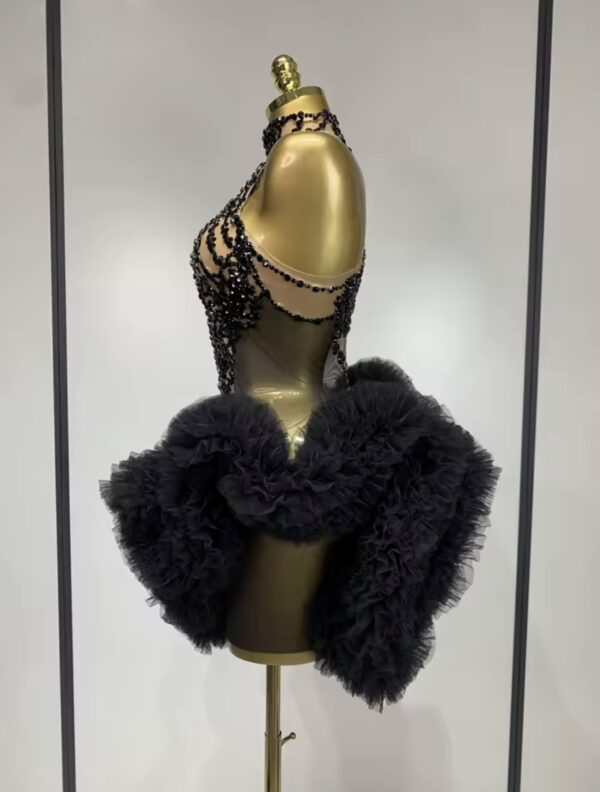 A striking couture creation designed for powerful entrances. Midnight Empress features cascading black crystal embellishments that drape elegantly from the neckline, creating the illusion of liquid jewels flowing across the body. The intricate beadwork highlights the silhouette while the dramatic layered tulle skirt adds volume, movement, and theatrical elegance.